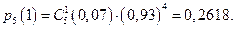 Пример. Вероятность выхода за границы допусков при изготовлении детали равна 0,07. Найти вероятность события: из пяти выбранных наудачу деталей одна выходит за границы допусков. Очевидно,