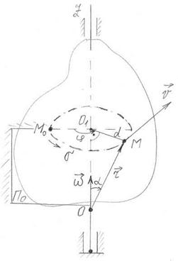 Размерность w [1/с] или [рад/с]. Тогда Скорости точек тела при вращении вокруг неподвижной оси пропорциональны их кратчайшим расстояниям до этой оси. Коэффициентом пропорциональности является угловая скорость. Скорости точек направлены по касательным к траекториям и, следовательно, перпендикулярны радиусам вращения. Определим скорость любой точки тела через вектор угловой скорости. Теорема: Скорость любой точки тела при его вращении вокруг неподвижной оси равна векторному произведению угловой скорости тела на радиус–вектор точки, проведенный из любой точки на оси вращения: