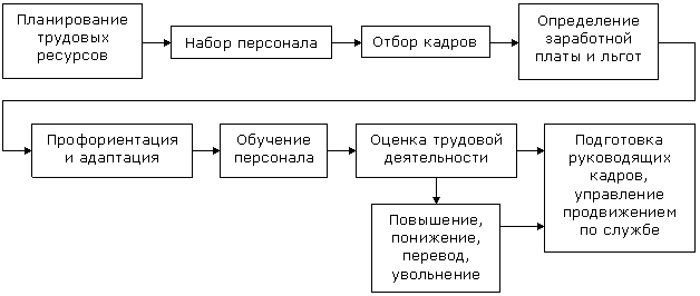 Организационные ресурсы экономической деятельности включают два вида ресурсов: вещественные (капитал, технологии, материалы, информация) и человеческие (люди). Эффективное использование ресурсов является важнейшей экономической проблемой. Персонал организации - это все ее работники, выполняющие производственные или управленческие операции и занятые переработкой предметов труда с использованием средств труда. От знаний, умений, способностей и мотивов к труду у работников зависит степень использования вещественных ресурсов. На современном этапе развития рыночной экономики в эпоху бурного развития НТП и информационных потоков, быстро меняющихся нужд и запросов потребителей, повышения конкуренции за ресурсы высокое качество кадрового потенциала, его эффективное использование определяет развитие организации, ее конкурентоспособность. Постоянно меняющийся рынок способен разрушить любую организацию, если она не готова к переменам. Чтобы выжить, надо правильно и своевременно оценить окружающий мир, тенденции общественного развития и адаптироваться к быстро меняющейся среде. В этих условиях "кадры решают все", они являются основой организации, ее самым ценным ресурсом и управление этим ресурсом составляет главную обязанность менеджмента. Управление персоналом - часть менеджмента, которая изучает проблемы эффективного использования персонала для достижения организационных и личных целей. В управлении персоналом имеются два крайних подхода - технократический и гуманистический. При технократическом подходе на первом месте стоят интересы производства, экономические задачи. Управление персоналом сводится к подбору кадров с соответствующими профессионально-квалификационными характеристиками и их расстановке исходя из задач организации производства и труда. При гуманистическом подходе эффективность производства во многом зависит не только от соответствия количественного и качественного состава рабочей силы требованиям техники и технологии, но и от уровня мотивации работника, что требует большого внимания к учету интересов работника как личности: повышения содержательности труда, улучшения условий труда, реализации личных целей. То есть, управление персоналом базируется на решении не только экономических, но и социальных задач. Эта концепция получила распространение в практике развитых капиталистических государств, начиная с 70-х годов XX века, и признана мировым сообществом, в частности МОТ (международная организация труда), ведущей. Известный американский менеджер Ли Якокка так определил роль персонала в развитии организации: "Все хозяйственные операции можно в конечном счете обозначить тремя словами: люди, продукт, прибыль. На первом мест стоят люди. Если у вас нет надежной команды, то из остальных факторов мало что удается сделать ". (Ли Якокка. Карьера менеджера) Успехи предприятия автомобильной промышленности в Японии определяются: на 40% - работой с кадрами, на 30% - управлением материально-техническим снабжением, на 20% - управлением качеством и на 1% - технологиями. Процесс управления персоналом состоит из нескольких этапов: Рисунок 1. Основные этапы процесса управления персоналом
