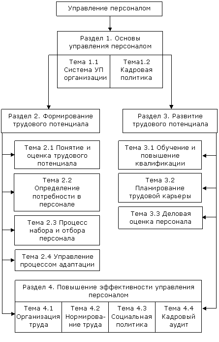 В учебном курсе "Управление персоналом" рассматриваются вопросы эффективного использования персонала на всех этапах процесса управления персоналом в соответствии с требованиями к уровню подготовки выпускника специальности 0602. В соответствии с рабочей программой в содержании курса выделяются четыре раздела. В I разделе рассматриваются теоретические основы управления персоналом, раскрывается содержание кадровой политики. Второй и третий разделы посвящены вопросам технологии управления персоналом применительно к основным этапам процесса управления персоналом. Во втором разделе - это процесс формирования трудового потенциала организации, в третьем - обучение, повышение квалификации и служебное продвижение персонала. В четвертом разделе рассматриваются вопросы создания условий для более полного использования трудового потенциала - это вопросы рациональной организации труда, социальной политики, кадрового аудита. Структурно-логическая схема содержания дисциплины "Управление персоналом" показана на рис. 2. Рисунок 2. Структурно-логическая схема дисциплины "Управление персоналом" (УП)