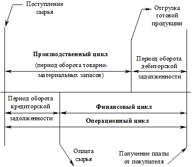 Период полного оборота всей суммы оборотных средств, в процессе которого происходит последовательная смена их форм, называется операционным циклом. Операционный цикл – период времени, началом которого является момент поступления на предприятие сырья и материалов, а окончанием – момент поступления от клиента денег за проданный ему товар. Производственный цикл начинается с момента поступления сырья и материалов на склад предприятия и заканчивается в момент отгрузки покупателю продукции, которая была изготовлена из этого сырья и материалов. Финансовый цикл начинается с момента оплаты поставщикам стоимости закупленных материалов (погашение кредиторской задолженности) и заканчивается в момент получения денег от покупателя за отгруженную продукцию (погашение дебиторской задолженности). Представление о структуре этих циклов дает схема на рис. 16.