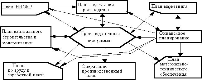 Тема 11. Производственная программа предприятия и производственные мощности предприятия Роль нормативов в планировании Неотъемлемой частью планирования на предприятии являются нормы и нормативы. Под нормой понимается научно обоснованная мера затрат живого или общественного труда на изготовление единицы продукции или выполнение заданного объема работ. Норматив характеризует степень использования ресурса на единицу измерения продукции или работы (на единицу площади, веса и т.д.). Различают нормы (нормативы): - затрат живого труда; Совокупность норм и нормативов представляет собою основу для текущего и перспективного внутрифирменного планирования. На базе этих норм формируются балансы потребления материальных ресурсов, энергобалансы и т.д. По степени детализации различают нормы специфицированные и сводные. По методу разработки: - расчетно-аналитические; Вся совокупность норм и нормативов образует нормативное хозяйство фирмы, которое вводится в АСУ и используется для оперативного планирования и управления производством, планирования всех видов деятельности предприятия и организации подготовки производства. Например, при планировании МТС используют удельные затраты материалов на единицу готовой продукции. Норма расхода материала включает: - полезный расход материала; Важным показателем является коэффициент использования материала (отношение чистой массы изделия к норме расхода). Норма запаса материалов служит для установления потребного завоза на планируемый период с учетом порядка их поступления от поставщиков, размеры складских помещений, допустимого расхода оборотных средств для создания материальных запасов. Устанавливаются также нормы текущего, страхового запаса и их суммы (складского запаса). Производственная программа является результатом согласования следующих целей фирмы: - получение максимальной прибыли; Следовательно, при разработке конкретной производственной программы надо учесть сроки и объемы поставок продукции на рынок (чем обычно занимается отдел маркетинга — план сбыта) и максимальную равномерную загрузку производственных мощностей (за это отвечает ПДО). Соответственно на основании производственной программы должны быть сформированы (или скорректированы) другие разделы комплексного плана предприятия (рис. 15.2).
