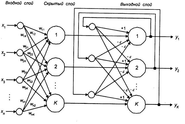 Структура: Тип входных сигналов – бинарные векторы, тип выходных сигналов – целые числа. Сеть состоит из входного, скрытого и выходного слоев нейронов. Скрытый и выходной слои содержат по K нейронов, где K – число эталонов. Выходы нейронов выходного слоя подаются на входы всех нейронов этого же слоя, причем на этот же нейрон – с коэффициентом 1, а на остальные – с отрицательным ослабляющим (ингибиторным) коэффициентом.