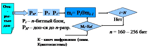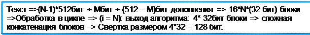 Первым шагом при выработке хэш-свертки является разбиение входных данных на последовательность битовых блоков определенной длины. Дополнения до блока требуемой длины возможно: нулями, пробелами, иными символами, вычисленными по определенным правилам значениями. При программировании в среде.NET справочную информацию по способам построения блоков требуемой длины можно получить в справке к System.Security.Cryptography. PaddingMode (режимы дополнения). При использовании в программах данного пространства имен можно добиться автоматического дополнения входных блоков данных до требуемой длины.