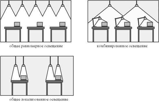 Искусственное освещение применяют в часы суток, когда естественный свет не достаточен, или в помещениях, где он отсутствует. По принципу организации искусственное освещение делят на два вида: общее (равномерное и локализованное) и комбинированное