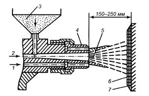 Рис. 4.53. Схема газопламенного напыления порошкового материала с помощью транспортирующего газа: 1 — смесь кислорода с горючим газом; 2 — транспортирующий газ; 3 — напыляемый порошок; 4 — сопло; 5 — факел; 6 — покрытие; 7 — подложка Напыление с одновременным оплавлением (газопорошковая наплавка) используется для восстановления деталей с местным износом до 3—5 мм, работающих при знакопеременных и ударных нагрузках, изготовленных из чугуна, конструкционных, коррозионностойких сталей и др. материалов. Основой установки для напыления порошковых покрытий с одновременным оплавлением является типовая сварочная горелка, дополненная устройством для подачи порошка в газовое пламя. Установки для напыления различаются степенью механизации (ручные и машинные), мощностью (очень малой, малой, средней и большой мощности), способом подачи порошка (инжекторный и безинжекторный). Технологический процесс восстановления деталей с газопламенным нанесением покрытий в общем случае включает следующие операции: — предварительный нагрев восстанавливаемой детали до 200—250 °С; — нанесение подслоя, как основы для наложения основных слоев; — нанесение основного слоя покрытия с необходимыми физико-механическими свойствами; — механическая обработка нанесенного слоя и контроль покрытия. При прочих равных условиях предварительный подогрев детали и нанесение подслоя влияют на прочность сцепления покрытия с основным металлом. Она зависит также от способа подготовки поверхности к напылению, использования терморегулирующих порошков, эффективной мощности пламени, способа и параметров процесса распыления, наличия в материале покрытия поверхностно активных добавок, применяемого оборудования и др. факторов. Обработка напыленных покрытий твердостью до 40HRCэ осуществляется резанием твердосплавными инструментами и инструментами из сверхтвердых материалов. Токарную обработку рекомендуется выполнять в следующей последовательности: снятие фасок у краев покрытия; проточка нанесенного слоя от середины покрытия к концам детали до устранения неровностей нанесенного слоя или окончательная обработка восстановленной поверхности с требуемой точностью и шероховатостью. Обработку напыленных поверхностей производят также шлифованием на соответствующих станках (круглошлифовальных, внутри шлифовальных, плоскошлифовальных). В этом случае обязательно применение охлаждающей жидкости, например, 2—3%-ного раствора кальцинированной соды. Шлифование проводится непосредственно после нанесения покрытий или после предварительной токарной обработки. Шлифование напыленных покрытий твердостью до 60HRCэ выполняется кругами из карбида кремния или белого электрокорунда, а при твердости более 60HRCэ — алмазными кругами.