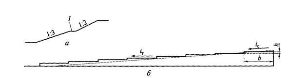 Рис. 12.9. Откос: а - основные элементы: 1 — подножье; 2 — поверхность; 3 — бровка; 4 — гребень; h - заложения откоса; l — длина заложения откоса; б — обозначение на плане Основным видом деформации откосов является их оползание (рис. 12.9). Разрушение откоса может происходить внезапно или проявляться в виде длительного оползания, что чаще наблюдается на глинистых фунтах. Возможными причинами разрушения откосов обычно становятся излишняя крутизна, увлажнение грунта, увеличение нагрузки на гребне или динамическое воздействие. Для повышения устойчивости высоких откосов и предотвращения возможного сползания грунта в середине откоса размещают горизонтальную площадку - берму, при этом нижнюю часть откоса проектируют более пологой, чем верхнюю (рис. 12.10), Ширина бермы зависит от высоты откоса. Например, для откоса высотой более 6 м ее ширина должна быть не менее 1,5...2 м. Таблица 12.2. Крутизна естественного откоса