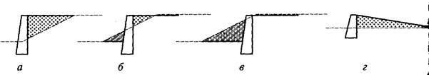 Рис. 12.18. Деформации подпорных стенок: а - опрокидывание, б - сдвиг; в – навал стенки на грунт.