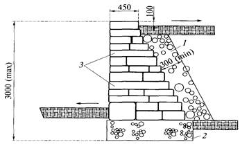 Рис. 12.21. Конструкция подпорной стенки из камня — «сухая кладка»: 1 – Щебёночная засыпка;; 2 – щебень; 3 – перевязочный камень