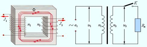 Рисунок 7.13. Простейший трансформатор и его условное изображение в схемах. n 1 и n 2 – числа витков в обмотках Ситуация резко изменяется, когда в цепь вторичной обмотки включается сопротивление нагрузки R н, и в ней возникает переменный ток J 2 (t). Теперь полный магнитный поток Φ в сердечнике создается обоими токами. Но согласно правилу Ленца магнитный поток Φ2, создаваемый индуцированным во вторичной обмотке током J 2, направлен навстречу потоку Φ1, создаваемому током J 1 в первичной обмотке: Φ = Φ1 – Φ2. Отсюда следует, что токи J 1 и J 2 изменяются в противофазе, то есть имеют фазовый сдвиг, равный 180°. Другой важный вывод состоит в том, что ток J 1 в первичной обмотке в режиме нагрузки значительно больше тока холостого хода. Это следует из того, что полный магнитный поток Φ в сердечнике в режиме нагрузки должен быть таким же, как и в режиме холостого хода, так как напряжение u 1 на первичной обмотке в обоих случаях одно и то же. Это напряжение равно ЭДС источника e 1 переменного тока. Так как магнитные потоки, пронизывающие обмотки, пропорциональны числу n 1 и n 2 витков в них, можно записать для первичной обмотки: