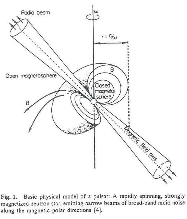 Идея создания (пассивного!) механо-оптического ротора в лаборатории как ключевого звена эталона частоты была давно известна: в 40-х годах XX века Dr. Jesse W. Beams (after in University of Virginia 1958-1960 he was president of American Physical Society) развил технику магнитной подвески железных роторов (рис ‘) в вакууме с чрезвычайно высокой стабильностью, для различных приложений в физике, гравитации, биологии и др[1]. В частности, ротор массой Но после открытия пульсаров (1968 г.), вращающихся, замагниченных нейтронных звезд, стало ясно, что в природе такие, почти идеальные роторы уже существуют. После нескольких лет изучения феномена пульсаров была окончательно принята его модель: вращающийся радио маяк (см. рис.). В настоящее время известно более 1000 таких объектов есть пульсары в составе двойных звезд, есть подкручиваемые (recycled) пульсары (еще более привлекательные как f-standard’s) - Радио излучение пульсара - это случайный r.f фон shot noise, фильтрованный через спектральную сетку с частотно зависимой модуляцией интенсивности. Главная модуляция (для удаленного наблюдателя) – производится вращением звезды, образуя луч широкополосного ЕМ-шума, “чиркающий” по наземной антенне. Радио телескопы могут регистрировать излучение пульсаров через весьма сложную процедуру: квадратичное детектирование огибающей, низкочастотная многоканальная фильтрация, когерентное накопление и т.д. Детали формы (и ее эволюции) импульса важны для изучения магнитосферы источника. Для целей измерения (изучения) временных характеристик – эти детали можно игнорировать: - при всех отличиях, средняя форма сохраняется на временах ~ десятков лет (уже! по наблюдениям). - Физика стабильности пульсарной частоты. Пульсар – гигантский замагниченный вращающийся шар с Кинетическая энергия вращения