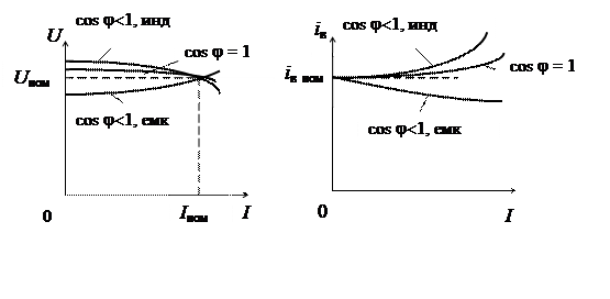 2. Характеристика короткого замыкания (рис.9.2). Снимается при замкнутых накоротко выводах обмотки статора, постоянной частоте вращения и постепенном увеличении тока возбуждения до значения, при котором ток короткого замыкания превышает номинальный рабочий ток статорной обмотки не более чем на 25%. 3. Отношение короткого замыкания (ОКЗ). Один из важных параметров синхронной машины, равный отношению тока возбуждения, соответствующего номинальному напряжению при холостом ходе (i в0), к току возбуждения, соответствующему номинальному току статора при опыте короткого замыкания (i вк). Для ненасыщенной машины можно считать: ОКЗ = i в0/ i вк » 1 / xd. ОКЗимеет большое практическое значение при оценке свойств синхронной машины. Машины с малым ОКЗ менее устойчивы при параллельной работе, имеют значительные колебания напряжения при изменениях нагрузки, но они имеют меньшие габариты и, следовательно, дешевле, чем машины с большим ОК З. Для неявнополюсных машин (турбогенераторов) ОКЗ находится в диапазоне 0,4…0, 7; для явнополюсных – 1,0…1,4. 4. Внешняя характеристика. Зависимость напряжения на выводах обмотки статора от тока нагрузки при неизменных: токе возбуждения, коэффициенте мощности нагрузки, частоте вращения (U = f (I н) при i в = const, cos j = const, n = const). На рис.9.3 представлены внешние характеристики, соответствующие различным по характеру нагрузкам синхронного генератора: активной (cos j = 1), индуктивной (cos j < 1, инд) и емкостной (cos j < 1, емк).