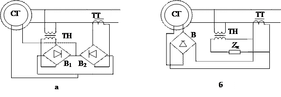 В системах прямого компаундирования ток обмотки возбуждения СГ должен определяться двумя составляющими, пропорциональными напряжению и тока. Составляющая, пропорциональная напряжению, необходима для обеспечения режима холостого хода и создания основного потока возбуждения. Составляющая, пропорциональная току нагрузки, служит для компенсации тех факторов, которые вызывают снижение напряжения при изменении нагрузки, и обеспечения необходимого для срабатывания защитной аппаратуры значения установившегося тока короткого замыкания. В зависимости от того, как осуществляется суммирование сигналов, пропорциональных напряжению и току, различают системы: § прямого токового компаундирования, суммирование арифметическое (рис. 9.8, а); § прямого фазового компаундирования, суммирование геометрическое рис. 9.8, б). В схеме прямого токового компаундирования (рис. 9.8, а) суммирование происходит на стороне постоянного тока, в результате фаза тока по отношению к напряжению не учитывается, поэтому ток возбуждения генератора не зависит от коэффициента мощности нагрузки, а определяется только значением напряжения и тока статора. Данная схема обеспечивает точность лишь ±10%. К ее недостаткам также можно отнести наличие двух выпрямителей.