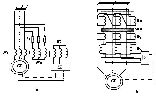 Рис. 9.12. Схемы системы прямого фазового компаундирования с параллельным электромагнитным суммированием каналов тока и напряжения посредством трехобмоточного трансформатора: а– с компаундирующим сопротивлением; б– с магнитным шунтом Опыт проектирования показывает, что с точки зрения массогабаритных показателей электрическое суммирование целесообразно применять в системах возбуждения генераторов с высокоомными обмотками возбуждения. Отечественные генераторы традиционно выпускаются с низкоомными обмотками, поэтому их системы возбуждения, как правило, имеют электромагнитное суммирование.