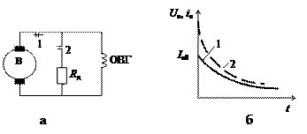Рис. 9.15. Гашение поля: а– схема; б - кривые изменения тока 1 и напряжения 2