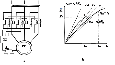 От значения добавочного сопротивления R д зависит как скорость гашения поля, так и максимальное напряжение на зажимах обмотки возбуждения. Для цепи возбуждения напряжением 110…220 В значение добавочного сопротивления обычно составляет 4…5 r в, для цепи возбуждения напряжением 24…48 В R д = (7…8) r в. Время гашения можно значительно уменьшить, если вместо добавочного активного сопротивления включить нелинейное сопротивление, увеличивающееся по мере уменьшения тока возбуждения. Системы прямого компаундирования. Работа этих систем возбуждения зависит от взаимного расположения регулировочных характеристик системы возбуждения и генератора, точки пересечения которых являются точками установившегося режима. Увеличение сопротивления цепи возбуждения приводит к тому, что при сопротивлении цепи возбуждения выше критического указанные характеристики не пересекаются (рис.9.16, б), т.е. машина развозбуждается. Подобный способ гашения поля применяется в схемах компаундирования с последовательным включением канала тока и напряжения (рис. 9.16, а). Величина добавочного сопротивления определяется требуемым временем гашения поля (»4 Т в) и допустимым перенапряжением на обмотке возбуждения.