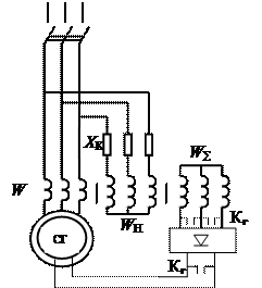 Рис. 9.17. Схема гашения поля возбуждения СГ с системой прямого фазового компаундирования с параллельным соединением каналов тока и напряжения Допускается шунтирование на постоянном токе и шунтирование входных зажимов выпрямителя со стороны переменного тока (шунтирование на переменном токе). Гашение поля в обеих схемах происходит медленно, с постоянной времени обмотки возбуждения. Однако в схеме с шунтированием на переменном токе из-за влияния вентилей в проводящем направлении процесс гашения поля несколько ускоряется. Для заметного ускорения процесса гашения поля в схемах с шунтированием можно в контур цепи возбуждения включать добавочное сопротивление по аналогии со схемой на рис. 9. 16, а.