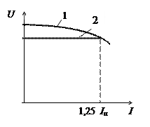Рис. 9.18. Внешние характеристики СГ: с корректором напряжения (2) и без него (1) В схемах с последовательным соединением каналов напряжения и тока исполнительный силовой элемент корректора напряжения должен включаться последовательно или изменять параметры элементов, включенных последовательно с обмоткой возбуждения. В схемах систем с параллельным соединением каналов напряжения и тока он должен включаться параллельно или изменять параметры элементов, включенных параллельно обмотке возбуждения (рис. 9.19).