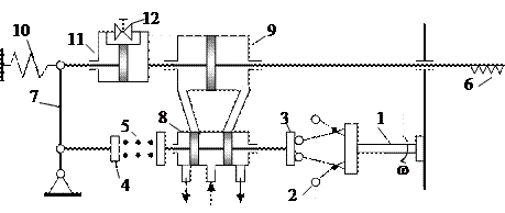 Рис. 10.5. Конструктивная схема изодромного регулятора частоты вращения непрямого действия. 10 – пружина изодрома; 11 – цилиндр изодрома; 12 – жиклер (дроссельный клапан)