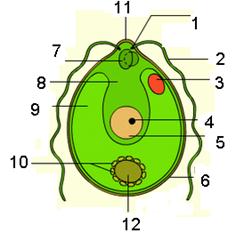 1. Порядок Вольвоксовые (Volvocales) – планктонные водоросли монадной структуры, т.е. снабженные жгутиками одноклеточные и колониальные зеленые водоросли, подвижные в течение всей вегетативной жизни. Род хламидомонада (Chlamidomonas) насчитывает свыше 500 видов. Почти все они обитатели мелких, хорошо прогреваемых и сильно загрязненных водоемов. Это активные санитары загрязненных вод, в которых они очень быстро размножаются и вызывают зеленое цветение. Хламидомонас хоботковый - вид имеет плотную оболочку, спереди образующую заметное выпячивание – носик, от которого отходят два равных по длине жгутика. Всю внутреннюю часть клетки занимает чашевидный хлоропласт, в сильно утолщенном дне которого, расположен шаровидный пиреноид с крахмальной сферой. В верхней части, на хлоропласте находится крупный хорошо заметный красный глазок, а внутри вырезки хлоропласта расположено видимое без специальной окраски крупное шаровидное ядро с отчетливо различимым ядрышком.