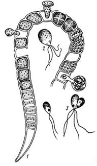 Примером является род кладофора (Сlаdophora) (рис. 6). Слоевище кустистое построено разветвленными нитями, состоящими из расположенных в один ряд сегментов. В местах со стоячей водой слоевища кладофоры сильно разрастаются, образуя огромные спутанные массы, или тину. К субстрату прикрепляется ризоидами. Размножается кладофора половым и бесполым способами. Гаметы с 2 жгутиками, зооспоры четырехжгутиковые. Гаметы образуются в любом из сегментов и выходят после созревания через одну пору. Кладофора используется для получения бумаги и как набивочный материал.