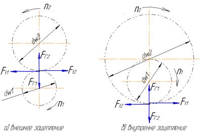 2. После оценки диаметра вала, разрабатывают его конструкцию, т.е. определяют его размеры, такие как а, в, с и др. По диаметру предварительно выбирают подшипники. 3. Выполняют проверочный расчет на усталость и, если нужно, вносят исправления в размеры. При этом учитывают, что диаметр вала определяет размеры и нагрузочную способность подшипников. Бывают случаи, когда диаметр вала определяется не его прочностью, а прочностью подшипников. Поэтому расчеты вала и подшипников взаимосвязаны. 4. Выполняют проверку статической прочности вала для условий кратковременной перегрузки. Примечания: · Средний диаметр согласно п.1 для входного и выходного валов выбирают по внутреннему диаметру подшипника из ряда: 10, 12, 15, 17, 20, 25, 30, 35 и далее через 5мм. Для промежуточного вала диаметр определяется из ряда нормальных размеров. · Подробно вопрос расчета вала на циклическую прочность (на усталость) с примером расчета рассмотрен в пособии автора «Прочностные расчеты валов редукторных передач», РГАТА, 2003.- 27 с. Направление сил в зацеплении зубчатой передачи.