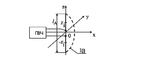 Полуволновой вибратор состоит из двух прямолинейных проводников, симметрично расположенных на одной линии ОZ, с небольшим промежутком между ними, рис. 4. Внутренние (срединные) концы проводников, к которым подключают генератор высокой частоты (ГВЧ), называют клеммами. Подключенный к клеммам проводников ГВЧ является причиной формирования в них переменной ЭДС. Под действием последней свободные электроны начинают совершать колебательное движение, создавая электромагнитное излучение в окружающем пространстве. Вообще симметричный вибратор можно представить как длинную линию, разомкнутую на конце, провода которой развернуты на 1800 (рисунок 5). Благодаря этому токи в симметричных относительно клемм точках Zi и –Zi равны и направлены в одну сторону (рисунок 4). Распределение тока I(z) вдоль проводников симметрично (рис. 4). Для получения максимального тока в проводах вибратора (и соответственно максимального уровня излучения) должно быть выполнено условие резонанса. Т.е. когда длина волны колебаний ГВЧ совпадает с длиной волны собственных колебаний вибратора (