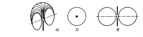 Поэтому ток уменьшается постепенно, сохраняя прежнее направление (рис. 6,г). За счет этого происходит перезаряд распределенной емкости. Когда ток спадает до нуля, емкости оказываются перезаряженными (рис. 6,д). После этого процесс протекает в обратном направлении (рис.6, е-и). Таким образом, в вибраторе возникают свободные электрические колебания. При этом при включении ГВЧв нем устанавливаются стоячие волны тока и напряжения, причем вдоль его длины укладывается половина стоячей волны тока и напряжения. Следовательно длина волны собственных колебаний симметричного вибратора вдвое больше его длины Известно, что излучающие свойства антенны зависят от характера распределения тока в излучающем проводе. Поэтому диаграмма излучения полуволнового вибратора (рис. 7, а, в) имеет максимум в направлении, перпендикулярном оси вибратора.