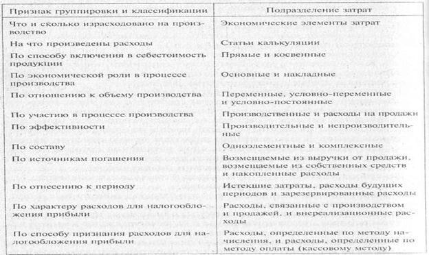 В зависимости от экономического содержания затраты на производственную и сбытовую деятельность в налогообложении прибыли делятся на расходы, связанные с производством и продажей, и внереализационные (в бухгалтерском учете, напомним, принята иная классификация). В затраты, связанные с производством и продажей, включаются материальные, на оплату труда, суммы начисленной амортизации, прочие расходы. К внереализационным относятся расходы на оплату услуг банков, в том числе на эксплуатацию системы «клиент-банк», проведение ежегодного собрания акционеров, содержание переданного по договору аренды (лизинга) имущества и др. По способу признания в налогообложении прибыли расходы классифицируют в зависимости от времени их признания: по мере начисления (способ начисления) и по дате их оплаты (кассовый способ). По экономическому составу затраты в бухгалтерском финансовом учёте классифицируют на основные и накладные. Основные затраты - затраты, непосредственно связанные с технологическим циклом производства продукта труда и его обслуживанием К основным относят затраты, связанные с подготовкой, освоением производства, самим производственным циклом (в том числе потери от Ирака, затраты на повышение качества выпускаемой продукции), а также расходы по обслуживанию процесса производства. Другими словами, основные затраты включают прямые расходы и расходы на эксплуатацию и обслуживание оборудования. Например, затраты материалов на технологические операции, заработная плата основных производственных рабочих, а также наладчиков и рабочих, занятых ремонтом оборудования, вместе с отчислениями на социальные нужды и др. Накладные затраты (расходы)- затраты, связанные с организацией производства и управлением. Накладные расходы включают затраты на хозяйственное обслуживание и управление в структурных подразделениях, аппарате администрации и функциональных службах предприятия. По отношению к физическим объемам производства и продал продуктов труда затраты делятся на переменные, условно-переменные и условно-постоянные. Переменные затраты - затраты, размер которых изменяется прямо пропорционально изменению физического объема производства Прямые затраты (как материальные, так и трудовые) всегда являются переменными, так как находятся в прямой зависимости от объема производства и продажи продукции. Затраты электроэнергии, топлива, вспомогательных материалов, которые относятся к общепроизводственным расходам, также могут быть переменными. От физических объемов производства и продажи зависят затраты на упаковку, складирование, выполнение погрузочно-разгрузочных работ, транспортировку, охрану грузов, относящиеся к расходам на продажи. Таким образом, часть косвенных расходов может быть классифицирована как переменные затраты. Эти затраты на единицу продукции являются постоянной величиной. Условно-переменные затраты - затраты, которые зависят от объема производства, но эта зависимость не является прямо пропорциональной. К условно-переменным затратам относят расходы на содержание и эксплуатацию машин и оборудования, а также заработную плату управленческого персонала в составе общепроизводственных расходов. Условно-постоянные затраты - затраты, которые практически не зависят от изменения объема производства продукции