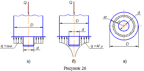 Первая гипотеза. Так как в данном случае опорная поверхность является плоскостью, то постоянное удельное давление (рисунок 26 а) определяется простым делением осевого усилия на площадь опорного кольца:
