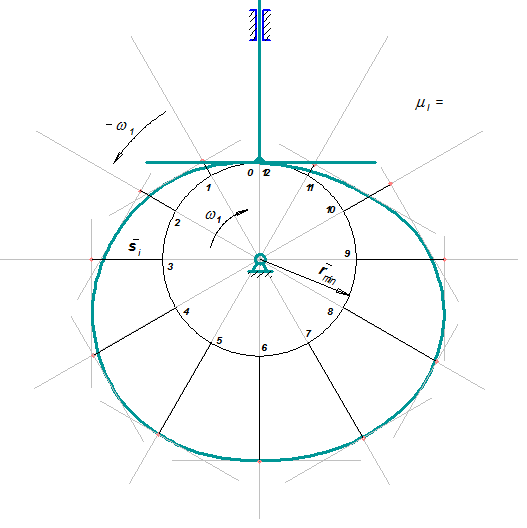 Как было отмечено выше при построении профиля кулачка применяется метод обращения движения. Вычерчивают окружность минимального радиуса и нулевое положение толкателя (толкатель опирается на окружность минимального радиуса). Придается всем звеньям угловая скорость (-wкул). Кулачок становится неподвижным, а толкатель со стойкой получают обращенное движение. Строят "n" положений толкателя в его обращенном движении и на каждом из них откладывают перемещения толкателя вдоль его оси в соответствии с заданным законом движения. Соединив отмеченные точки плавной кривой, получают теоретический профиль кулачка (рисунок 50).