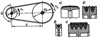 Классификация ременных передач: 1. По форме поперечного сечения ремня: плоскоременные (поперечное сечение ремня имеет форму плоского вытянутого прямоугольника, рис. 2.1.а); клиноременные (поперечное сечение ремня в форме трапеции рис. 2.1.б); поликлиноременные (ремень снаружи имеет плоскую поверхность, а внутренняя, взаимодействующая со шкивами, поверхность ремня снабжена продольными гребнями, выполненными в поперечном сечении в форме трапеции рис. 2.1.г); круглоременные (поперечное сечение ремня имеет форму круга рис. 2.1.в); зубчатоременная (внутренняя, контактирующая со шкивами, поверхность плоского ремня снабжена поперечными выступами, входящими в процессе работы передачи в соответствующие впадины шкивов). 2. По взаимному расположению валов и ремня: с параллельными геометрическими осями валов и ремнем, охватывающим шкивы в одном направлении – открытая передача (шкивы вращаются в одном направлении); с параллельными валами и ремнем, охватывающим шкивы в противоположных направлениях – перекрестная передача (шкивы вращаются во встречных направлениях); оси валов перекрещиваются под некоторым углом (чаще всего 90°) – полуперекрестная передача. 3. По числу и виду шкивов, применяемых в передаче: с одношкивными валами; с двушкивным валом, один из шкивов которого холостой; с валами, несущими ступенчатые шкивы для изменения передаточного числа (для ступенчатой регулировки скорости ведомого вала). 4. По количеству валов, охватываемых одним ремнем: двухвальная, трех -, четырех - и многовальная передача. 5. По наличию вспомогательных роликов: без вспомогательных роликов, с натяжными роликами; с направляющими роликами.