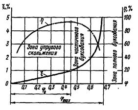 Рекомендуемые значения передаточных чисел фрикционных ременных передач представлены в табл. 2.2. Тяговая способность и долговечность ремня являются основными критериями работоспособности ременной передачи. Проектный расчет ременной передачи обычно выполняется по тяговой способности, а расчет долговечности при этом является проверочным. Проиллюстрируем поведение ременной передачи графиком, на котором по оси абсцисс отложен коэффициент тяги, а по оси ординат - коэффициент скольжения и КПД (рис. 2.4). На графике можно выделить три основных зоны: