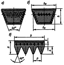 Особенности конструкции, работы и расчета клиноременных и поликлиноременных передач. Клиновые ремни имеют трапециевидное поперечное сечение, а поликлиновые – выполненную в форме сочленённых основаниями клиньев рабочую часть (рис. 2.5). Угол клина для обоих видов ремней одинаков и составляет 40°. На шкивах такой передачи выполняются соответствующие сечению рабочей части ремня канавки, называемые ручьями. Профили ремней и ручьёв шкивов контактируют только боковыми (рабочими) поверхностями (рис. 2.6). В клиноременных передачах для снижения изгибных напряжений часто применяют комплект из нескольких ремней (2…6), работающих параллельно на одной паре шкивов. размеры сечений клиновых ремней стандартизованы (ГОСТ 1284.1-89, ГОСТ 1284.2-89, ГОСТ 1284.3-89). Стандартом предусмотрено 7 ремней нормального сечения (Z, A, B, C, D, E, E0), у которых b0/h»1,6, и 4 – узкого сечения (YZ, YA, YB, YC), у которых b0/h»1,25. Ремни изготавливаются в виде замкнутого кольца, поэтому их длина тоже стандартизована.