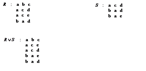 Рассмотрим пять основных операций: 1. Объединение. Пусть R, S отношения одинаковой арности. Объединением