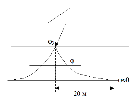 Потенциал токоведущей части падает до потенциала j3, где j3 = J3 · r3, где J3 - ток замыкания, r3 - сопротивление цепи в точке заземления. Далее потенциал начинает снижаться. (На расстоянии 20 м. j» 0). В связи с этим возникают следующие понятия: 1). Напряжение прикосновения - напряжение между 2-мя точками цепи тока, которых одновременно касается человек. В устройствах заземления и зануления: