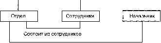 Для описания схемы сетевой БД используется две группы типов: "запись" и "связь". Тип "связь" определяется для двух типов "запись": предка и потомка. Переменные типа "связь" являются экземплярами связей. Сетевая БД состоит из набора записей и набора соответствующих связей. На формирование связи особых ограничений не накладывается. Если в иерархических структурах запись-потомок могла иметь только одну запись-предка, то в сетевой модели данных запись-потомок может иметь произвольное число записей-предков (сводных родителей). Пример схемы простейшей сетевой БД показан на рис. 2.5. Типы связей здесь обозначены надписями на соединяющих типы записей линиях.