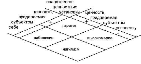Взаимоотношения сторон, вовлечённых в противостояние, их взаимопонимание и в конечном счёте возможность разрешения конфликта самым существенным образом зависят от нравственно-ценностных установок сталкивающихся субъектов. Нравственно-ценностная установка - это, коротко говоря, способ соотнесения субъектом собственной самоценности с самоценностью оппонента. Таких способов, предельно обобщая, можно различать четыре (см. Табл.1). Субъекту, действующему в соответствии с установкой раболепия, будет свойственно стремление подладиться под оппонента, подчиниться ему, признать его превосходство. Раболепный субъект часто готов каяться в существующих и несуществующих грехах. Вспомним хотя бы Хайяма: «Не ставь ты дураку хмельного угощенья, Чтоб оградить себя от чувства отвращенья: Напившись, криками он спать тебе не даст, А утром надоест, прося за то прощенья» (выделено мною - А.З.).