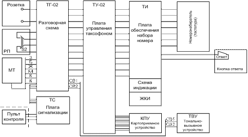 Таксофон подключается к абонентской линии с помощью розетки, которая подключает разговорную схему (плата ТГ-02). К разговорной схеме подключаются рычажный переключатель РП, микротелефон МТ, плата сигнализации ТС, тонально-вызывное устройство ТВУ, плата управления таксофоном (ТУ-02). Плата управления таксофоном контролирует выполнение всех функций: контроль карт, набор номера, тарификацию и т.д. К ней подключены кроме разговорной схемы картоприемное устройство КПУ и плата обеспечения набора номера (ТИ). Плата обеспечения набора номера обеспечивает оптическую индикацию набираемого номера на жидкокристаллическом индикаторе ЖКИ, к ней подключен кнопочный номеронабиратель и кнопка «ответа». Кнопка «ответа» через платы ТИ и ТУ-02 подключается к разговорной схеме. В исходном состоянии микротелефона таксофон находится в режиме ожидания вызова. При обслуживании входящего вызова или соединении со спецслужбами работа таксофона аналогична работе обычного телефонного аппарата. Рассмотрим работу таксофона при обслуживании платного исходящего соединения. Набор номера возможен только после ввода дебетной карты ДК в КПУ, причем дебетная карта должна иметь соответствующий код и не нулевой актив. При снятии микротелефона к абонентской линии подключаются разговорная схема, схема управления таксофоном, КПУ, схема индикации блока набора номера. Если вставлена дебетная карта, код которой не соответствует установленному в таксофоне, то на индикаторе высвечивается /-------/. При установке дебетной карты с 0-м активом попытка набора номера приводит к отбою. Если дебетная карта признана годной, на ЖКИ высвечивается актив дебетной карты в виде числа, что означает готовность таксофона к набору номера. Набираемый на номеронабирателе номер анализируется на соответствие номерам спецслужб. После набора префикса междугородной связи «8» таксофон автоматически включает в набор программированную паузу до 25с. Блокировка микрофона выполняется, когда введенная последовательность цифр перестает совпадать с номерами спецслужб. При наборе кода страны или города таксофон анализирует его и допускает набор только существующих кодов. После ответа вызываемого абонента при нажатии кнопки «ответ» разблокируется микрофон и абоненту предоставляется льготное время до 20с. При этом на ЖКИ выводится обратный отсчет секунд до окончания льготного времени. При продолжении соединения производится уменьшение актива дебетной карты на сумму стоимости интервалов тарификации, укладывающихся в льготное время плюс стоимость одного интервала тарификации. В дальнейшем уменьшение актива дебетной карты происходит по окончанию очередного интервала тарификации. При этом на ЖКИ выводится обратный отсчет секунд до момента очередной тарификации и актив дебетной карты. При извлечении дебетной карты из КПУ до конца льготного времени производится принудительный отбой. При обнулении актива дебетной карты блокируется микрофон, но абоненту предоставляется до 20 с для замены дебетной карты. После чего производится нормированный отбой. При своевременной замене дебетной карты микрофон разблокируется. При нажатии кнопки # при снятой трубке микротелефона происходит отбой, после чего нажатием кнопки * автоматически выполняется повторная выдача в абонентскую линию последнего