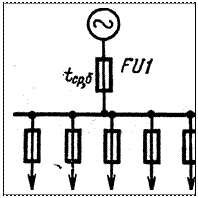 Между источником энергии и потребителем обычно устанавливается несколько предохранителей, которые должны отключать поврежденные участки по возможности селективно. Предохранитель FU1, пропускающий больший номинальный ток, имеет вставку большего сечения, чем предохранитель FU 2, установленный у одного из потребителей. При КЗ необходимо, чтобы повреждение отключалось предохранителем, расположенным у места повреждения. Все остальные предохранители, расположенные ближе к источнику, должны остаться работоспособными. Такая согласованность работы предохранителей называется избирательностью или селективностью. Для обеспечения селективности наименьшее время срабатывания FU1 (на больший ток) должно быть больше наибольшего времени срабатывания FU 2, из-за производственных допусков время срабатывания может отклоняться от номинального на ± 50% (разброс защитной характеристики) 0,5 tср.б > 1,5 tср.м т. е. для селективной работы время срабатывания предохранителя на больший ток должно быть в 3 раза больше, чем у предохранителя на меньший ток. Если нарушение селективности не ведет к серьезны нарушениям работы защищаемой установки, то при вы вставок отклонение характеристик предохранителей от номинальных можно принимать ±25%.