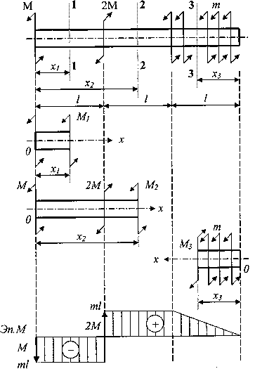 В исходных сечениях No 1,2 и 3 задаются положительными значениями внутренних крутящих моментов М1, М2, М3. Пусть М=ml. Для первого участка (рис.2 б):