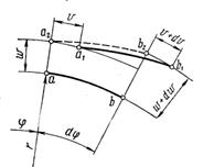 Перемещение элемента ab срединной поверхности до ее деформирования можно разбить на два этапа: 1) в положение a2b2 за счет радиальных перемещений W и (W + dW), 2) в положение a1b1 за счет окружных перемещений u и (u + du). Приращение длины элемента: на первом этапе a2b2 – ab = (r +W) dj – rd j = Wd j, на втором этапе приращение равно разности окружных перемещений конца элемента (u + du) – u = du. По условию нерастяжимости сумма приращений длины равна нулю: Wd j + du = 0, или du / dj = –W, или условие нера- u = – Функции (11.2) и (11.4) выражают статическую форму гибкого колеса. При вращении генератора с угловой скоростью wН текущее положение рассматриваемой точки относительно его большой оси определяется углом j = j1 - jН = j1 – wНt. При этом формулы (11.2) и (11.4) можно записать в виде: