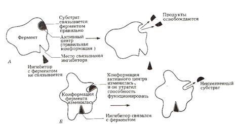 Низкомолекулярные вещества, способные тормозить ферментативные реакции, называются ингибиторами ферментов. Ингибирование бывает обратимым и необратимым. Ингибирование называют обратимым, если при определенных условиях ингибитор может быть отделен от фермента. Конкурентное обратимое ингибирование. В этом случае ингибитор, по своей структуре близок к субстрату. Он соединяется с активным центром фермента, но не может прореагировать с ним. Ингибитор преграждает субстрату доступ к активному центру. Эта форма ингибирования называется конкурентной, т.к. ингибитор и субстрат конкурируют за место на активном центре фермента. Оно обратимо, потому что при увеличении концентрации субстрата скорость реакции возрастает. Неконкурентное обратимое ингибирование. Ингибиторы этого рода не родственны по своей структуре субстрату данного фермента. В