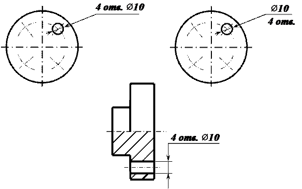 Размеры нескольких одинаковых элементов изделия наносят один раз с указанием на полке (или под полкой) линии-выноски количества этих элементов (рис.10).