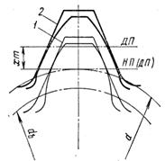 Смещение инструмента при нарезании зубьев На рис.6.12 изображено два положения инструмента (рейки) при нарезании зубьев: 1 – делительная плоскость рейки (ДП) совпадает с начальной плоскостью (НП) – нарезание без смещения; 2 – инструменту дано положительное смещение xm. При этом диаметры основной db и делительной d окружностей не изменяются, так как не изменяется z. Как видно по чертежу, смещение инструмента вызвало значительное изменение формы зуба. Толщина зуба у основания увеличилась, увеличилась и прочность зуба по напряжениям изгиба. Одновременно с этим заострилась головка зуба. Заострение является одной из причин, ограничивающих величину смещения инструмента. Отрицательное смещение инструмента сопровождается явлениями обратного характера. Применяют два типа передач со смещением: 1. Шестерню изготовляют с положительным смещением х1 > 0, а колесо с отрицательным х2 < 0, но так, что |x1| = |x2| или хS = x1 + x2 = 0.