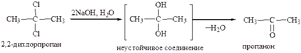 в качестве катализатора могут быть использованы: Ag, Cr, Ni, ZnO и другие. 3. Щелочной гидролиз дигалогенпроизводных углеводородов протекает через образование неустойчивого продукта замещения каждого галогена на гидроксильную группу: 4. Гидратация алкинов (реакция М.Г.Кучерова). В результате этой реакции получаются кетоны, только в случае гидратации этина получают этаналь.