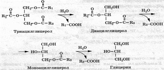 Распад нейтральных липидов происходит за счет гидролитического действия липаз: фосфолипиды расщепляются фосфолипазами. Распад приводит к образованию глицерина и жирных кислот, иногда фосфатов и аминоспиртов. Глицерин, получающийся в этой реакции, фосфорилируется до глицеро-1-Р, дегидрируется до диоксиацетон-Р и участвует далее в процессе гликолиза. Распад жирных кислот в результате β-окисления. На первой стадии жирные кислоты активируются реакции с ацил-СоА в присутствии АТР. Образующийся ацил-СоА постепенно окисляется при помощи дегидрогеназ и гидратаз до