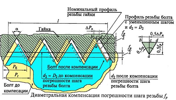 Влияние погрешностей шага резьбы на свинчивание резьбовых деталей. Погрешностью (отклонением) шага DP называется разность между действительным и номинальным размерами шага. Погрешность шага состоит из местных и прогрессивных погрешностей шага. Местные погрешности не зависят от длины свинчивания. Прогрессивные погрешности образуются в кинематических цепях резьбонарезания как результат неточностей изготовления и износа звеньев этих цепей, температурных и силовых деформаций динамической системы станок с кинематическими цепями - резьбонарезной инструмент - нарезаемая деталь, а также под действием других факторов. Прогрессивные погрешности в шаге нарезаемой резьбы возникают пропорционально числу витков на длине свинчивания. Обычно прогрессивные погрешности превышают местные. Обратимся к (рис. 3) и наложим на осевое сечение резьбы гайки, имеющей номинальные профиль и размеры, осевое сечение резьбы болта, у которого на длине свинчивания l шаг уменьшен, пропорционально числу шагов, на DPп.