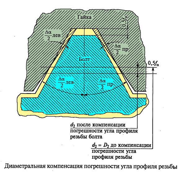 Рис. 4. Диаметральная компенсация погрешности угла профиля резьбы Погрешность a /2 при симметричном профиле резьбы находят как среднее арифметическое абсолютных значений погрешностей обеих половин угла профиля: Da /2 = (a /2 пр + a /2 лев)/2. Наложим на осевое сечение резьбы гайки, имеющей номинальные профиль и размеры, осевое сечение болта, имеющего погрешность половины угла профиля Da /2 (рис. 4). При равенстве средних диаметров резьбы болта и гайки (d2 = D 2) свинчивание этих деталей невозможно вследствие перекрытия профилей резьбы. Свинчивание резьбовых деталей, имеющих погрешность Da /2, так же как и имеющих погрешность шага, возможно только при наличии диаметральной компенсации f a, мкм, этой погрешности по среднему диаметру резьбы, которая может быть осуществлена или за счет уменьшения среднего диаметра резьбы болта, или увеличения среднего диаметра резьбы гайки. Для метрических резьб с симметричным профилем диаметральная компенсация погрешности угла профиля резьбы f a = 0,36Р Da /2, где P - шаг резьбы, мм; Da /2 - среднее абсолютных значений погрешностей обеих половин угла профиля, мин.