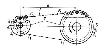 Цепная передача – это механизм, служащий для преобразования вращательного движения между параллельными валами при помощи цепи 1 и звездочек 2 (рис. 1).